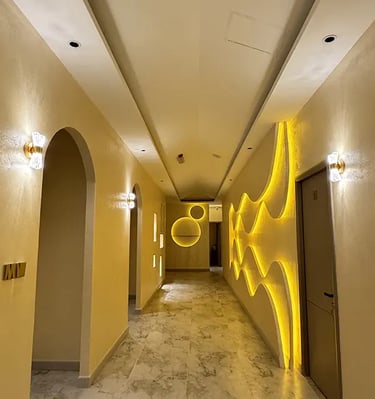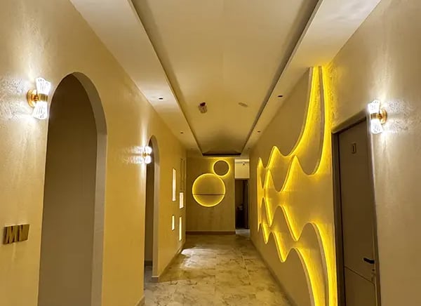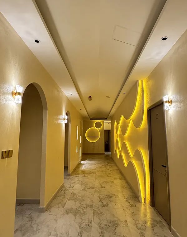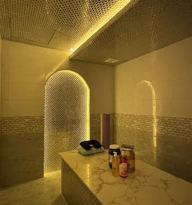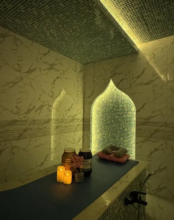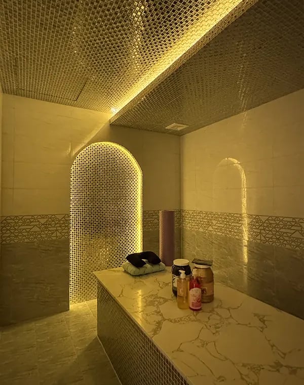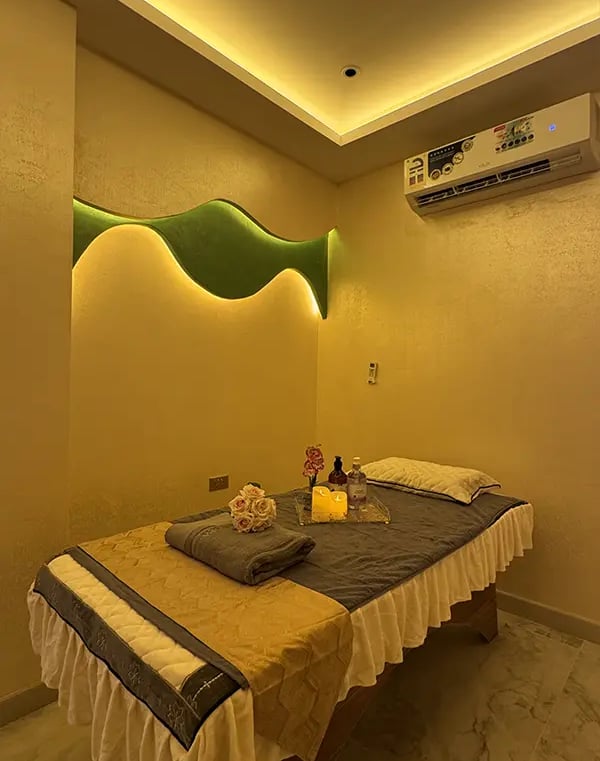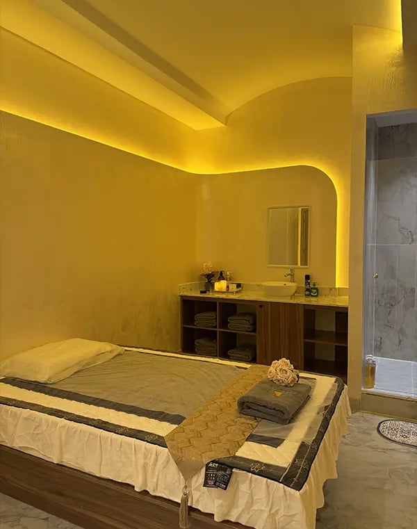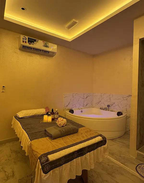 The spa features a tranquil space with soft lighting and soothing natural elements, creating a serene environment for relaxation.